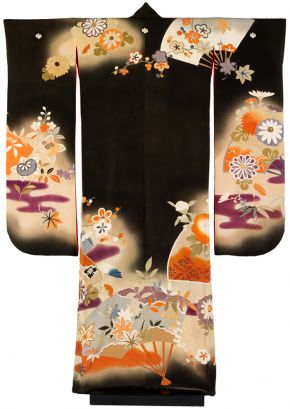 Elements of the natural world that appear on kimono usually have strong poetic associations, while more complex landscape scenes often refer to particular stories drawn either from classical literature or popular myths.While carrying an auspicious meaning, they also serve to demonstrate the literary discernment and cultural sensitivities of the wearer.Although such stories invariably involved people, it is relatively unusual to find human figures depicted on kimono. Instead there are objects which suggest their presence or recent departure, a pair of dropped fans, for example, alluding to lovers disturbed.