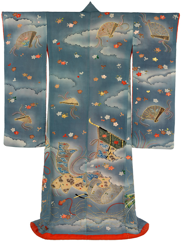 Elements of the natural world that appear on kimono usually have strong poetic associations, while more complex landscape scenes often refer to particular stories drawn either from classical literature or popular myths.While carrying an auspicious meaning, they also serve to demonstrate the literary discernment and cultural sensitivities of the wearer.Although such stories invariably involved people, it is relatively unusual to find human figures depicted on kimono. Instead there are objects which suggest their presence or recent departure, a pair of dropped fans, for example, alluding to lovers disturbed.