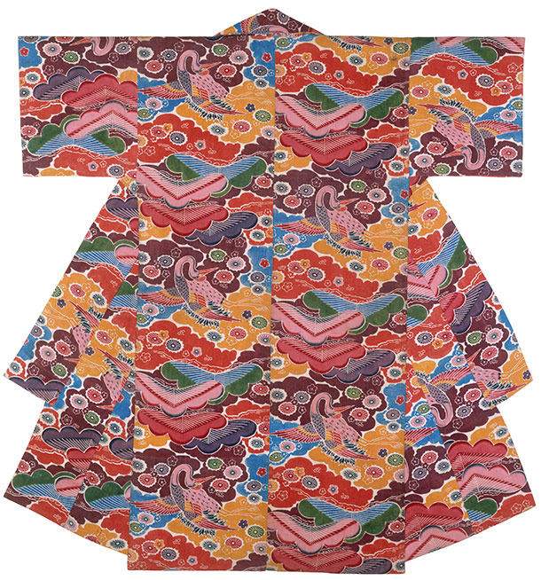 In creating these boldly patterned and brilliantly coloured kimono, textile designers benefited from technological advances made during the late 19th century. Power-operated spinning machines and jacquard looms introduced from Europe had speeded up production and lowered costs, while chemical dyes allowed for the creation of dazzling colours. In the early 20th century new types of silk and innovative patterning techniques were also developed, making relatively inexpensive, highly fashionable garments available to more people than ever before. These vibrant kimono styles remained popular until the 1950s.