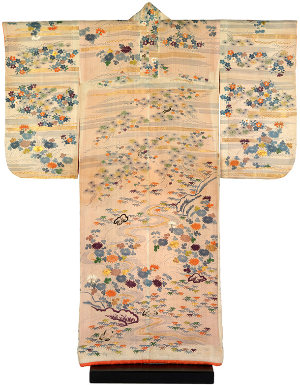 Birds, animals, butterflies and dragonflies also appear on kimono, along with other motifs drawn from the natural world such as water, snow and clouds. On some kimono whole landscapes of mountains and streams are depicted. The numerous different ways in which such popular natural motifs are used on garments is testament to the skill of kimono designers, and of dyers and embroiderers.