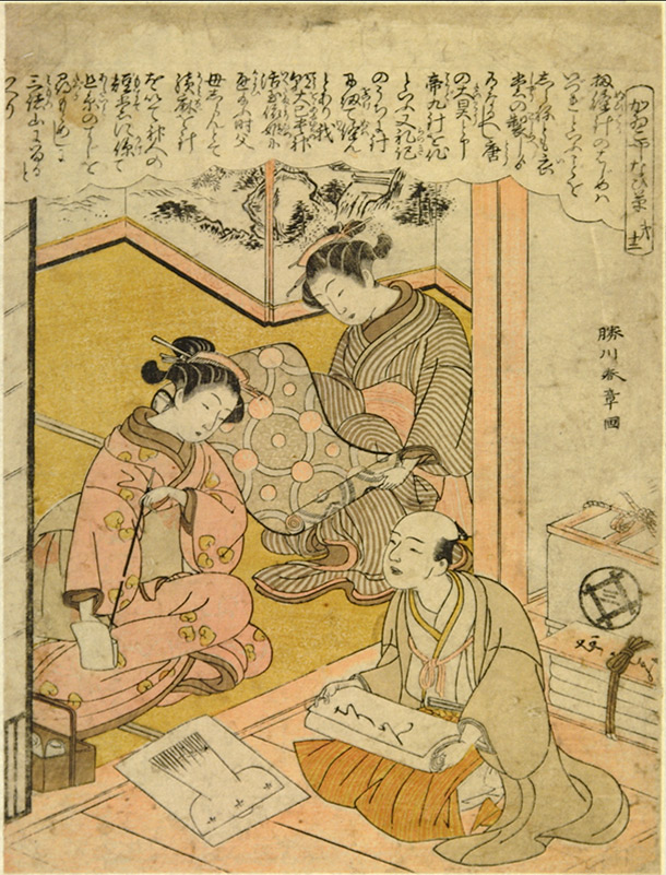 When choosing a kimono design, customers, and also the makers and sellers of kimono, could turn to pattern books (hinagata-bon) for assistance. These contained illustrations of the back of kimono with accompanying notes on colour and decoration. Books showing kimono being worn were also published, not so much to provide practical help but for the pleasure of thumbing through them, rather like today's fashion magazines.